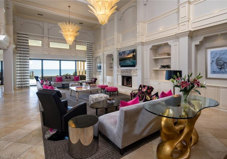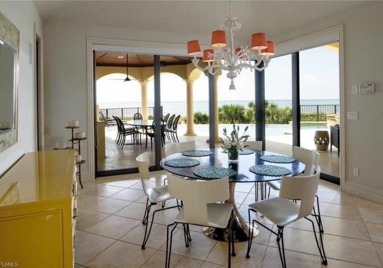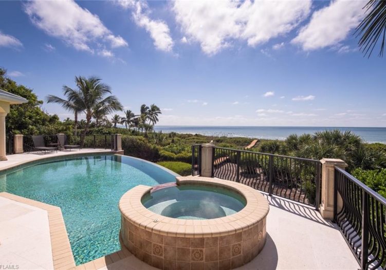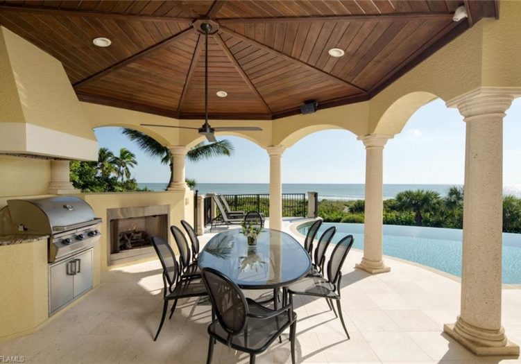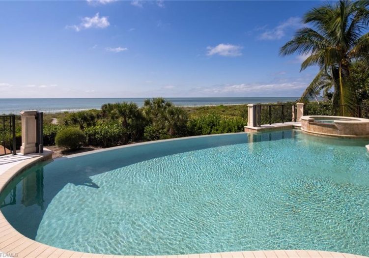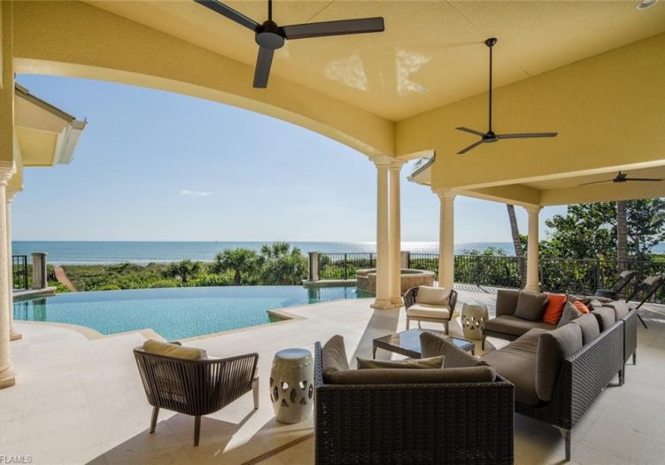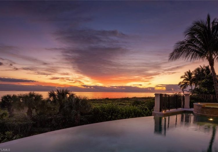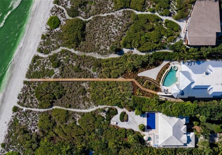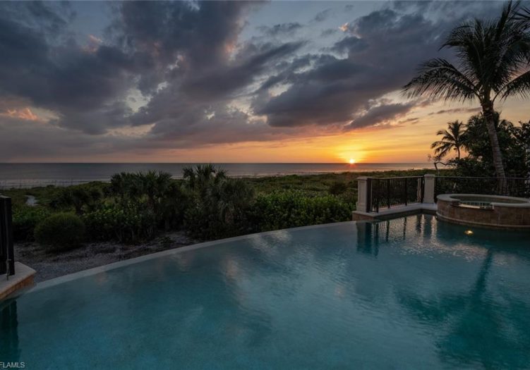 This distinguished beachfront property provides some of the most captivating views in all of Sanibel. Words can not describe the sense of awe and comfort when entering this home and seeing the style and view of the ocean. This stylish beachfront home was custom built in 2007 and exquisitely remodeled in 2019 by an award-winning Miami designer. The home flows with 5,900 sq. ft. of interior space, a great room design, 4 bedrooms, a den, amazing views of the Gulf of Mexico, and a seamless sense of openness with light-filled rooms and magnificent covered terraces. Enjoy the tranquility and peace from the elevated main level lux-bright saltwater infinity pool and spa. The spacious kitchen was designed for entertaining, features custom cabinetry, a large island, and top name appliances. A combination of marble, travertine, carpeting, and wood flooring throughout warms the spaces, while large picturesque windows and doors enhance the views. Additional highlights include handcrafted Venetian glass chandeliers in great room, magazine landscaping & lighting, an elevator, built-in spa, 2 – gas fireplaces, extensive storage, a 3+ car garage, and a composite boardwalk to the beach.